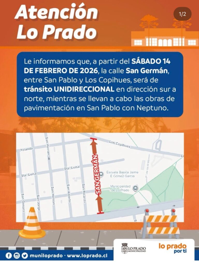 ATENCIÓN a quienes transitan hacia la comuna de #LoPrado: Debido a trabajos de pavimentación en San Pablo Con Neptuno, calle San Germán entre San Pablo y Los Copihues tendrá tránsito sólo hacia el norte durante tres meses. Opte alternativa