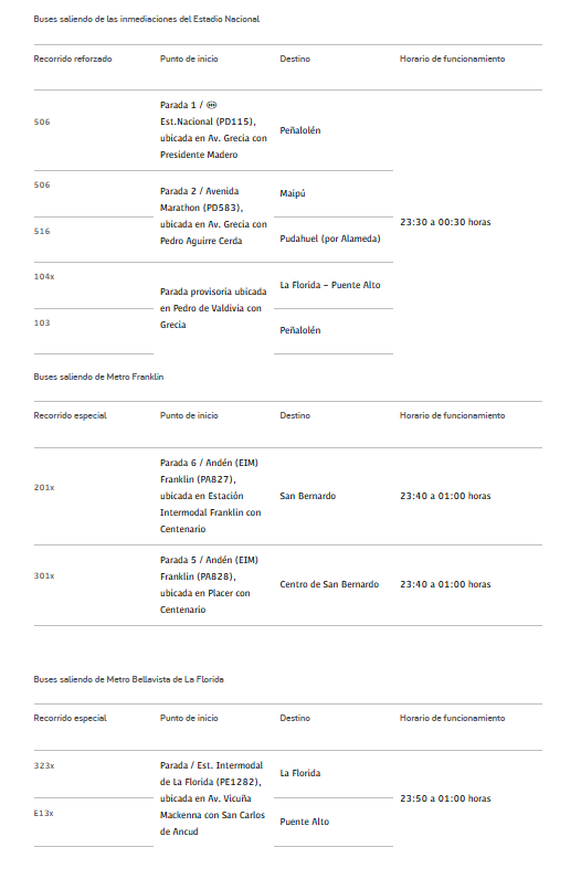 A partir de las 23:30 horas, habrá refuerzos de frecuencia de los siguientes servicios desde el Estadio Nacional: