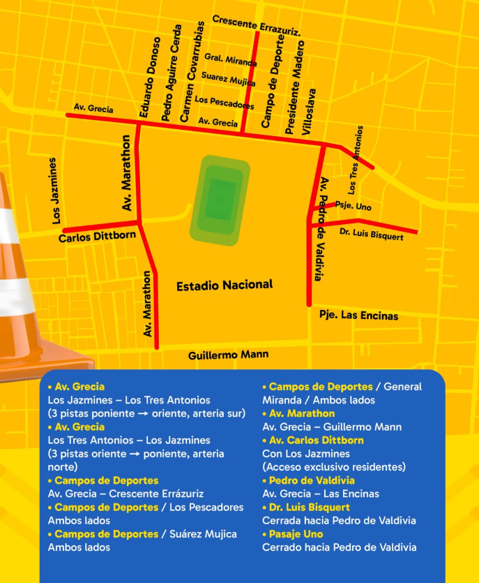 La restricción de tránsito vehicular afectará la calzada sur de Av. Grecia al oriente, Av. Marathón y Avenida Pedro de Valdivia al sur. También habrá medidas restrictivas para el desplazamiento peatonal, con el fin de facilitar la entrada al recinto deportivo, sólo al público que tenga su ticket de entrada. Se implementará un cerco de rejas especiales para este objetivo.