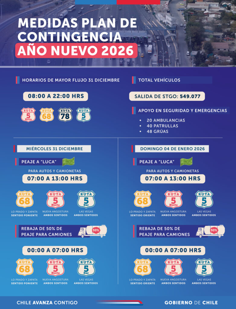 Para ello, se ha dispuesto para ese día 31 del llamado “peaje a luca”, cobro de mil pesos en los peajes Lo Prado y Zapata de la Ruta 68, en dirección poniente; y en los peajes Las Vegas (Ruta 5 Norte) y Angostura (Ruta 5 Sur), en ambas direcciones, de 07:00 horas a 13:00 horas.