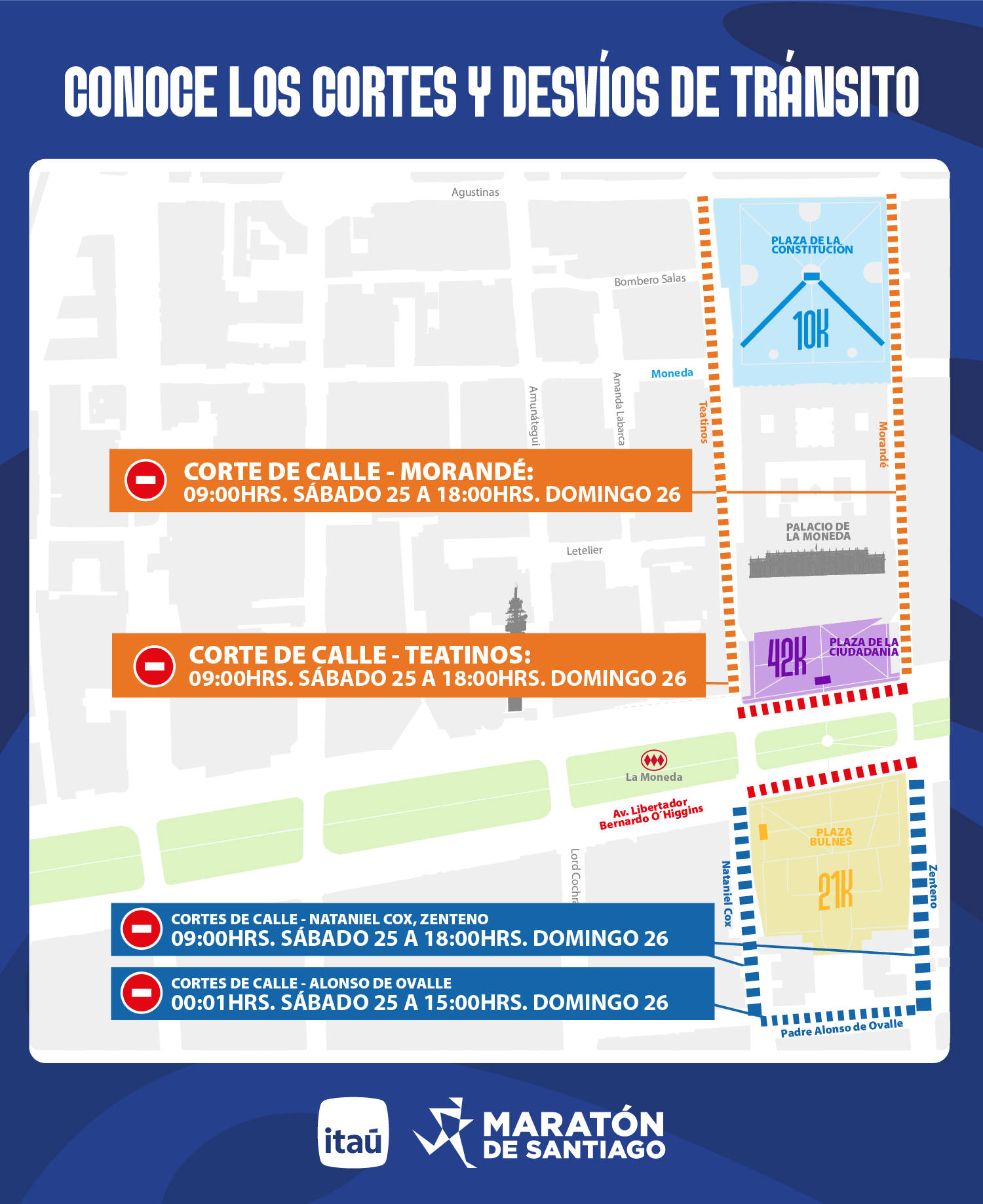 Maratón 42K: Largada en Avda. Alameda – Bernardo O’Higgins frente al Palacio de La Moneda (calzada norte), siguiendo por Alameda Bernardo O’Higgins hacia el poniente, Avda. España, Avda. Almirante Blanco Encalada, Avda. Beaucheff, Avda. Rondizonni, Avda. Viel, Avda. Manuel Antonio Matta, Avda. Grecia, Avda. Campos de Deportes, Avda. Antonio Varas, Avda. Pocuro, Avda. Los Leones, calle General José Artigas, Avda. Chile-España, Avda. José Pedro Alessandri, calle Rodrigo de Araya, calle Alcalde Jorge Monckeberg, Avda. Grecia, Rotonda Grecia, Avda. Américo Vespucio Sur, Plaza Egaña, Avda. Ossa, Avda. Américo Vespucio Sur, Avda. Américo Vespucio Norte, calle Francisco de Aguirre, calle Luis Carrera; Avda. Monseñor Escrivá de Balaguer, Nueva Costanera, calle Isabel Montt, Avda. Bicentenario, ex-Rotonda Pérez Zujovic, Avda. Andrés Bello (Costanera), calle Huelén, Avda. Providencia, Plaza Baquedano, Avda. Alameda – Bernardo O’Higgins, hasta el Palacio de la Moneda / Plaza de la Ciudadanía.