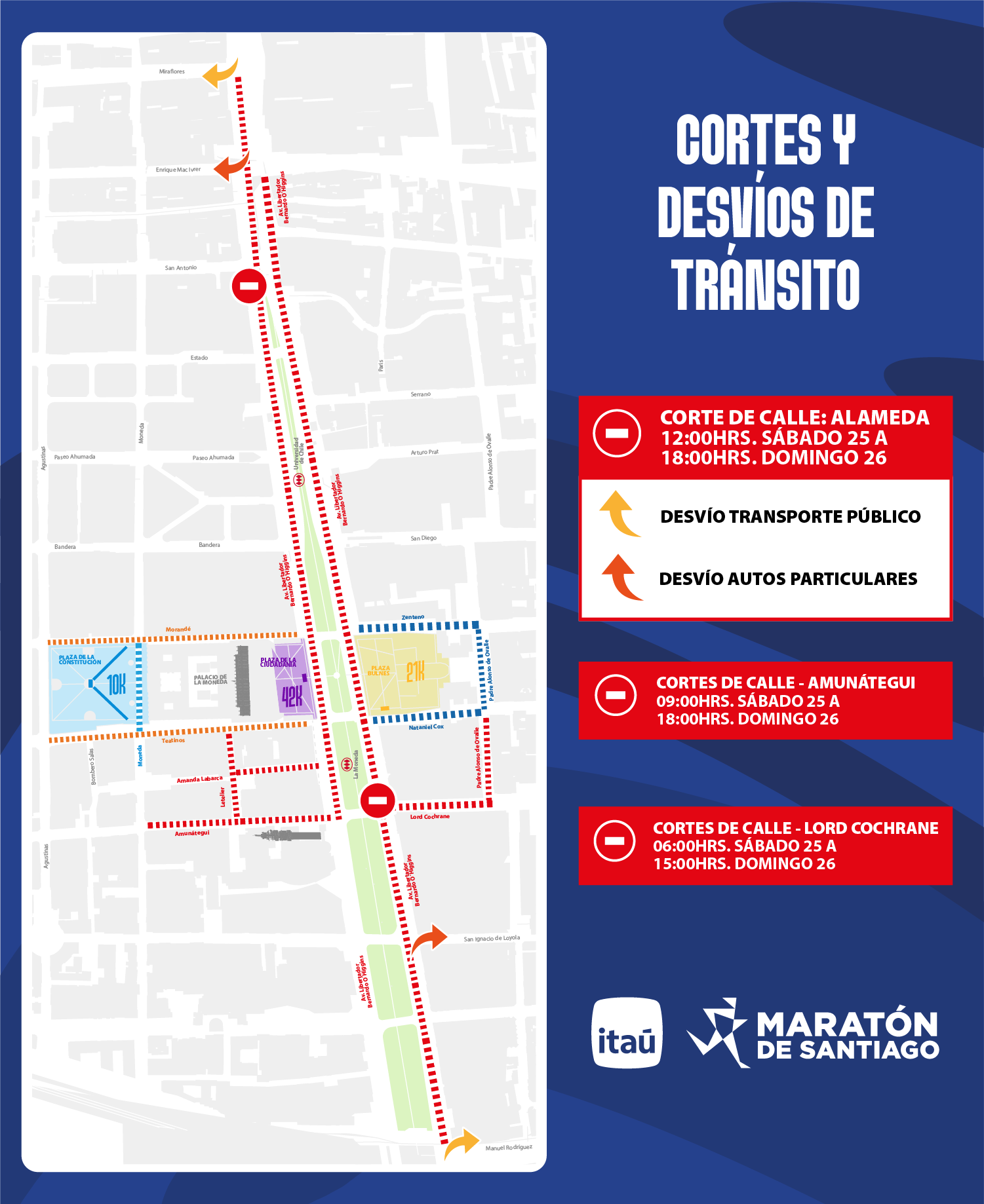 Corrida de Santiago 10K: Largada en Avda. Alameda – Bernardo O’Higgins frente al Palacio de La Moneda (calzada norte), siguiendo por Alameda Bernardo O’Higgins hacia el poniente, Avda. Manuel Rodríguez , calle Agustinas, calle Miraflores, Avda. Catedral, Bandera, Avda. General Mackenna, calle Ismael Valdés Vergara, calle Miraflores, Avda. Catedral Cardenal José María Caro, Andrés Bello, calle del Arzobispo, Avda. Providencia, Plaza Baquedano, Avda. Alameda – Bernardo O’Higgins, hasta el Palacio de La Moneda / Plaza de la Ciudadanía.