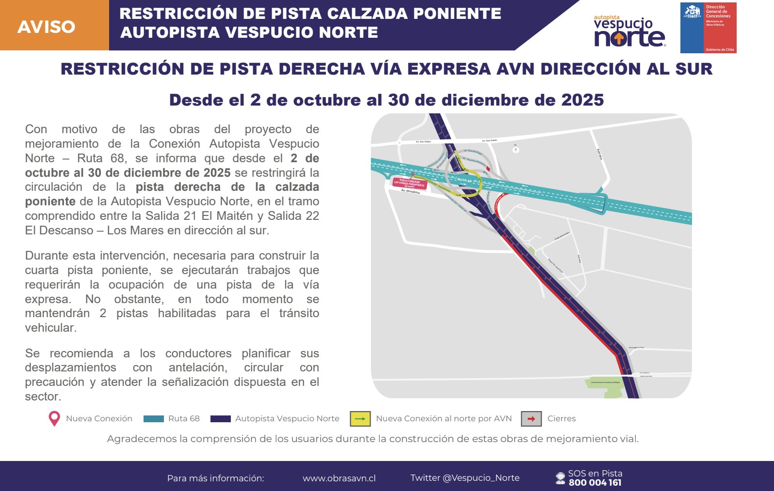 Desde la noche de este jueves 2 de octubre, se restringe el tránsito de la pista derecha de la Autopista Vespucio Norte en dirección al sur (Maipú) entre la Salida 21 El Maitén y la Salida 22 El Descanso, debido a obras de construcción en la ampliación de la vía expresa a una cuarta pista.